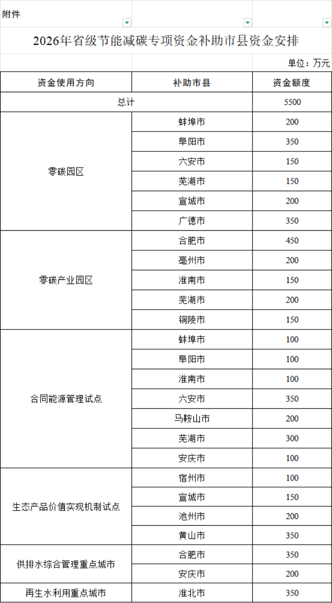 近日,安徽省发展改革委公示2026年省级节能减碳专项资金补助市县资金安排,资金总计5500万元,主要涉及零碳园区、零碳产业园区、合同能源管理试点、生态产品价值实现机制试点、供排水综合管理重点城市、再生水利用重点城市六个方向。