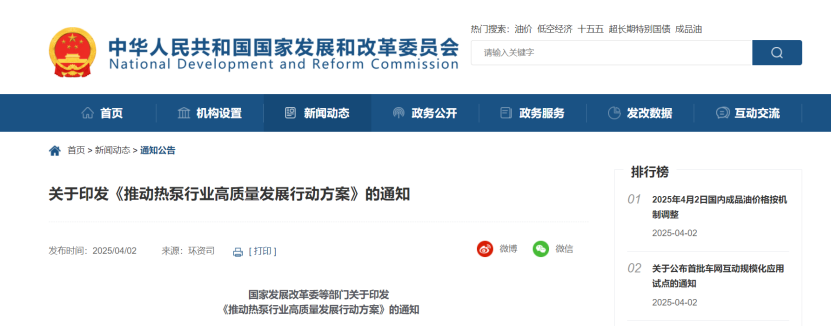 4月2日,国家发展改革委网站发布《推动热泵行业高质量发展行动方案》(以下简称《行动方案》),要求推动热泵行业高质量发展,统筹推进建筑领域应用,积极推进工业领域应用,扩大农业、交通运输等其他领域应用范围,开展存量低效热泵更新改造