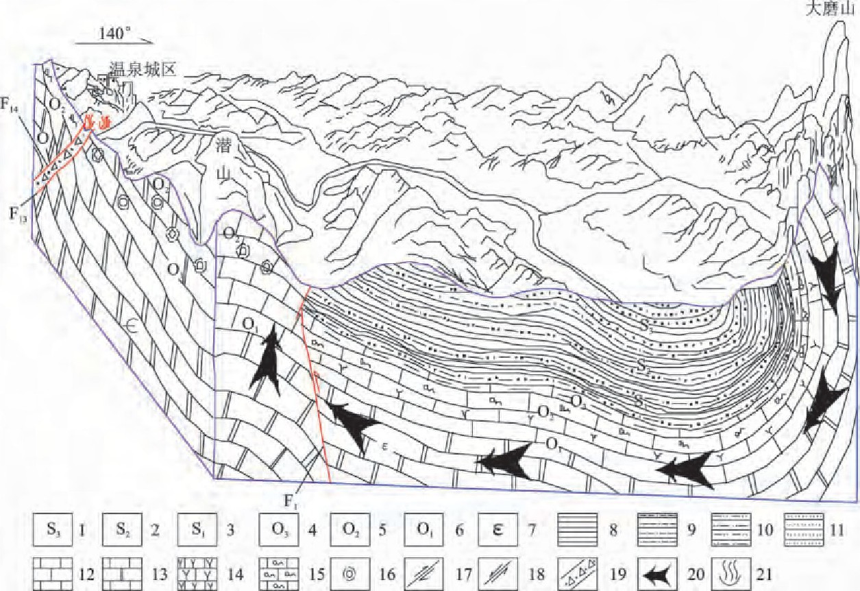 咸宁深层地热资源属于深循环加热型, 主要来源高山大气降水经过远程地下运移过程中吸收大地热流释放热能而逐渐增温。咸宁城区地热来源主要为东南部与潜山背斜相距8 km的大磨山背斜之高山裸露奥陶系灰岩受大气降水所致 (大磨山高程高出潜山高程20倍, 两地呈不对称“U”型箱状构造) 。