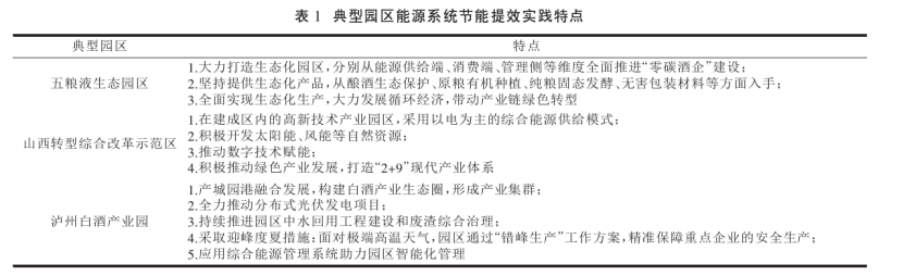 园区在推动我国实体经济发展和城镇化发展中发挥了关键作用,是支撑制造强国战略的主战场。有研究表明,园区二氧化碳排放量约占全国总排放量的31%[4],园区是资源能源消耗最集中的地方。现阶段,为了节约能源,保护环境,我国各级园区都在持续推动绿色低碳发展。田金平等研究指出我国工业园区节能提效实践创新主要体现在以下5个方面: ①聚焦重点领域,全过程系统性推进节能工作。②集中式能源基础设施升级改造,多样化开发利用余热、 余压和能量多级利用。③积极利用可再生能源,推进能源结构转型升级。④积极开展智慧能源探索,实现能源全过程精细化管理。⑤建立健全能源管理体系。表1为典型园区能源系统节能提效实践特点。